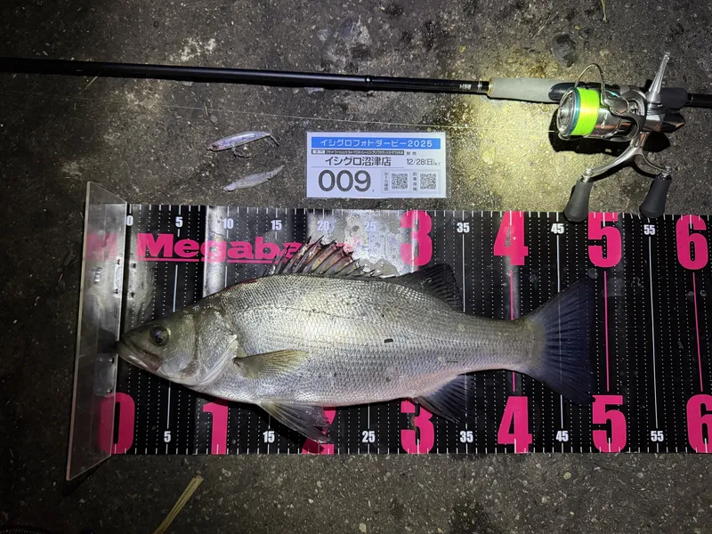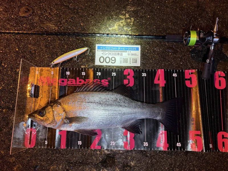 メーカー:DUO ルアー:シーク68S カラー:セクシーマジック ・ 釣場:沼津周辺 ・ 釣魚:ヒラスズキ ・ 釣り方:シーバスルアー ・ サイズ:ヒラスズキ48cm(情報元:イシグロ)
